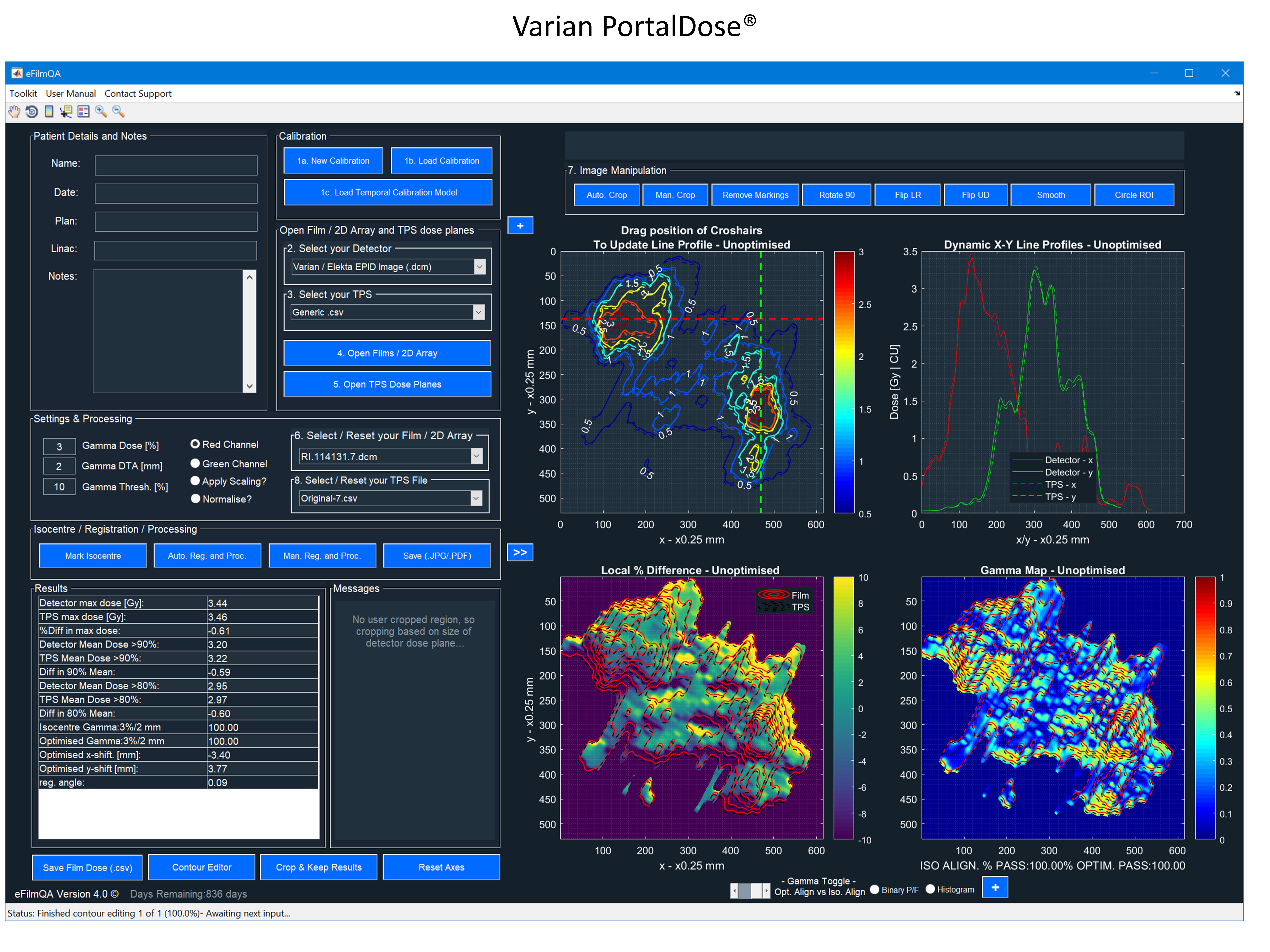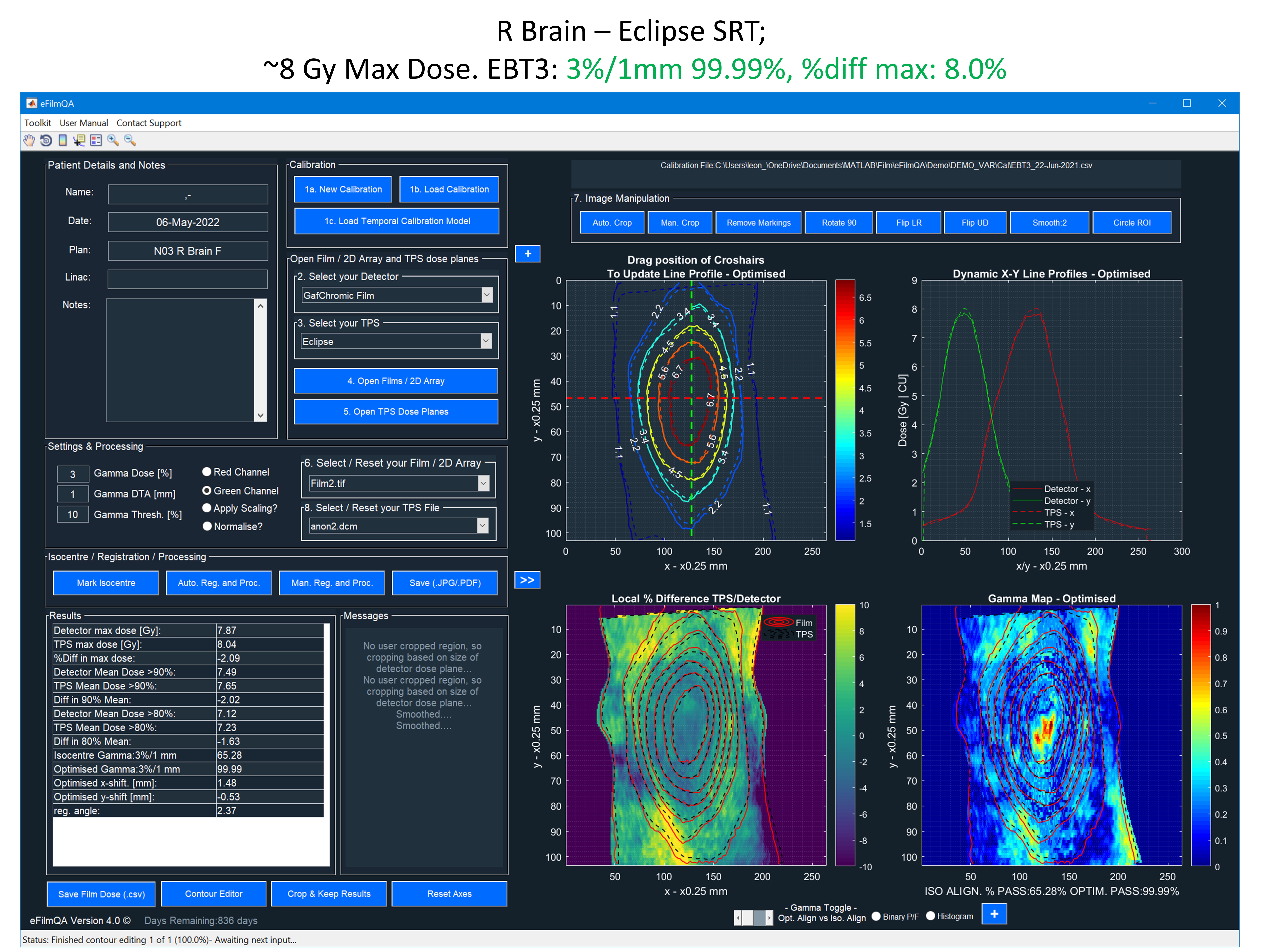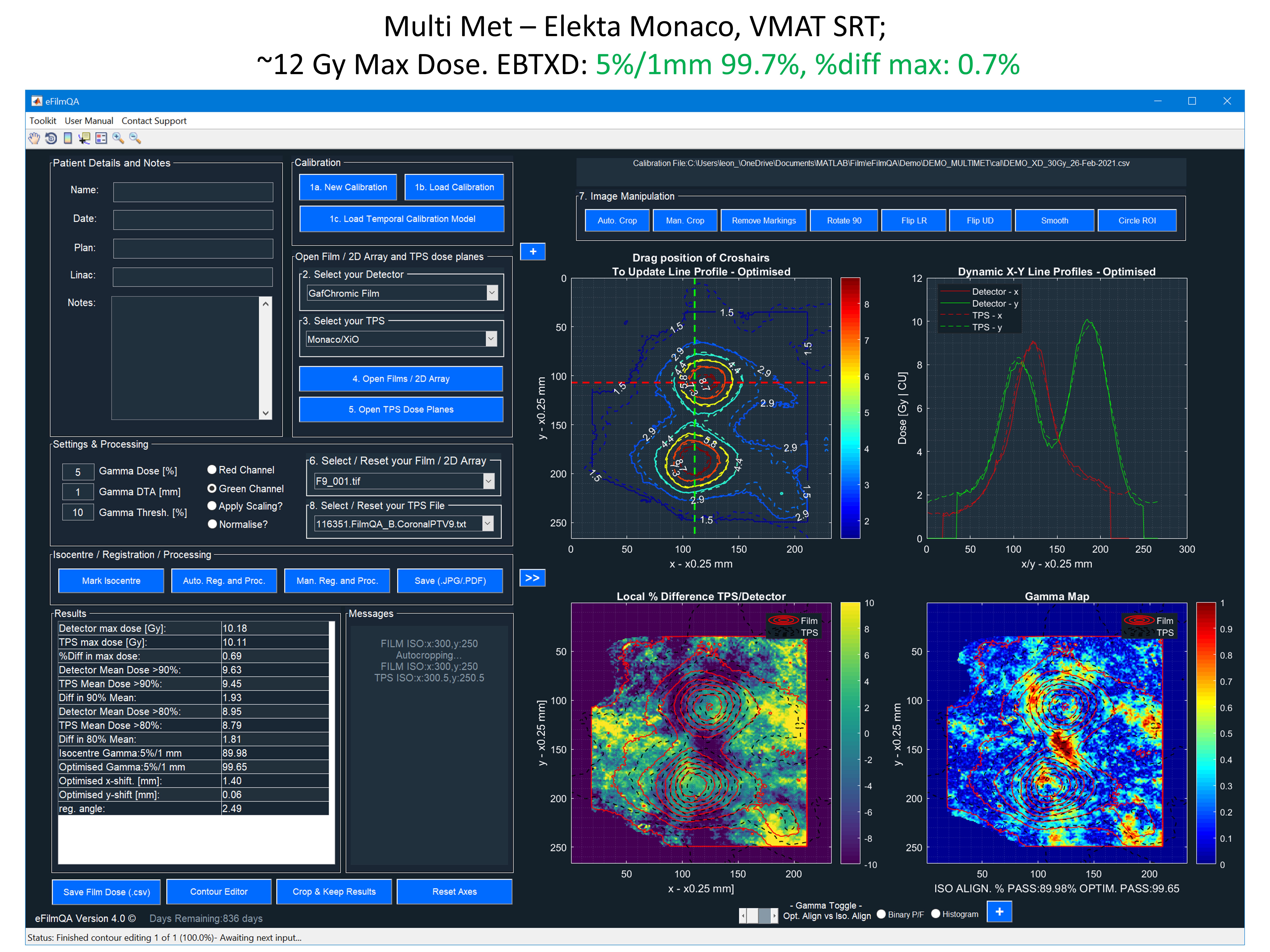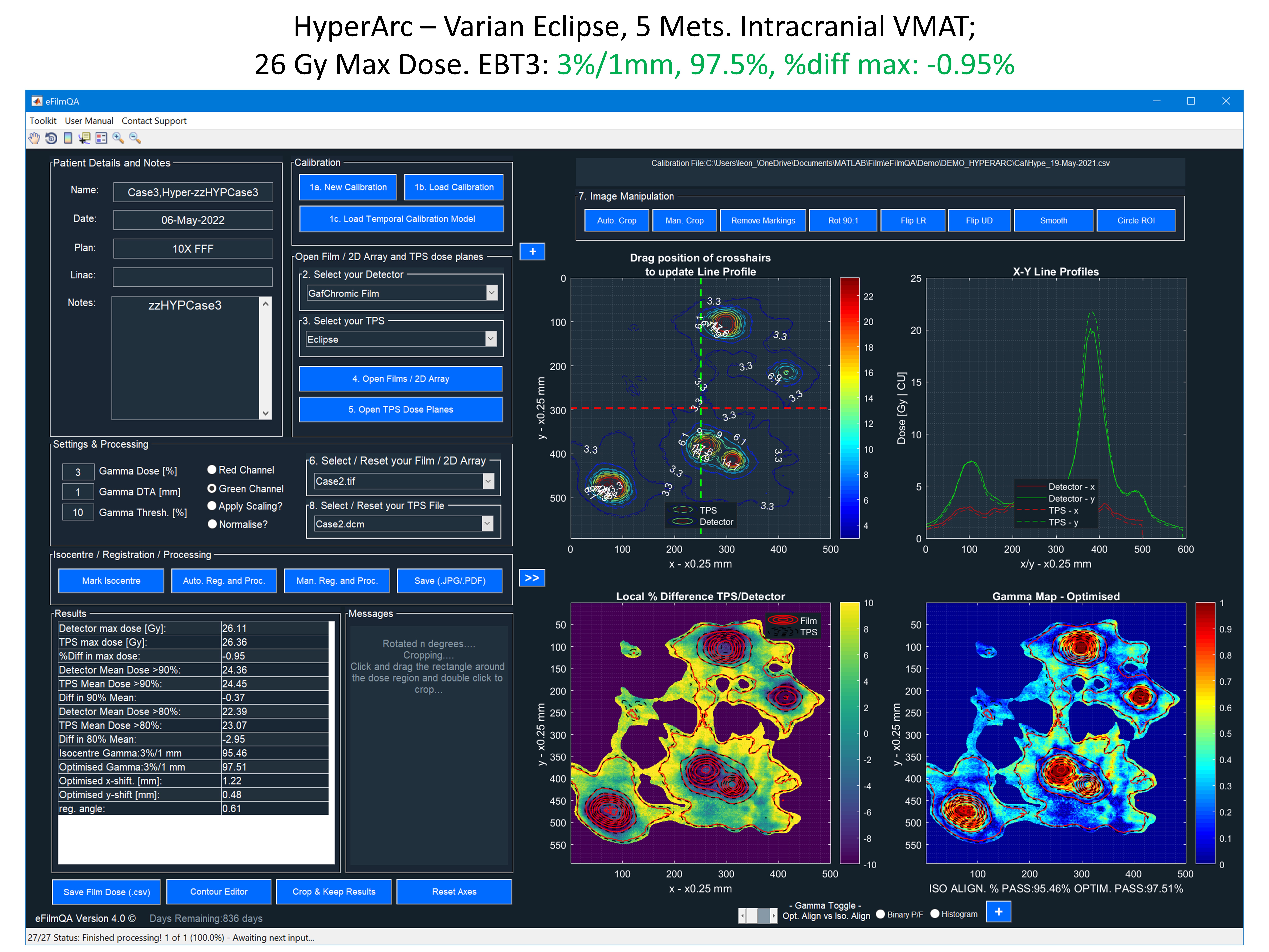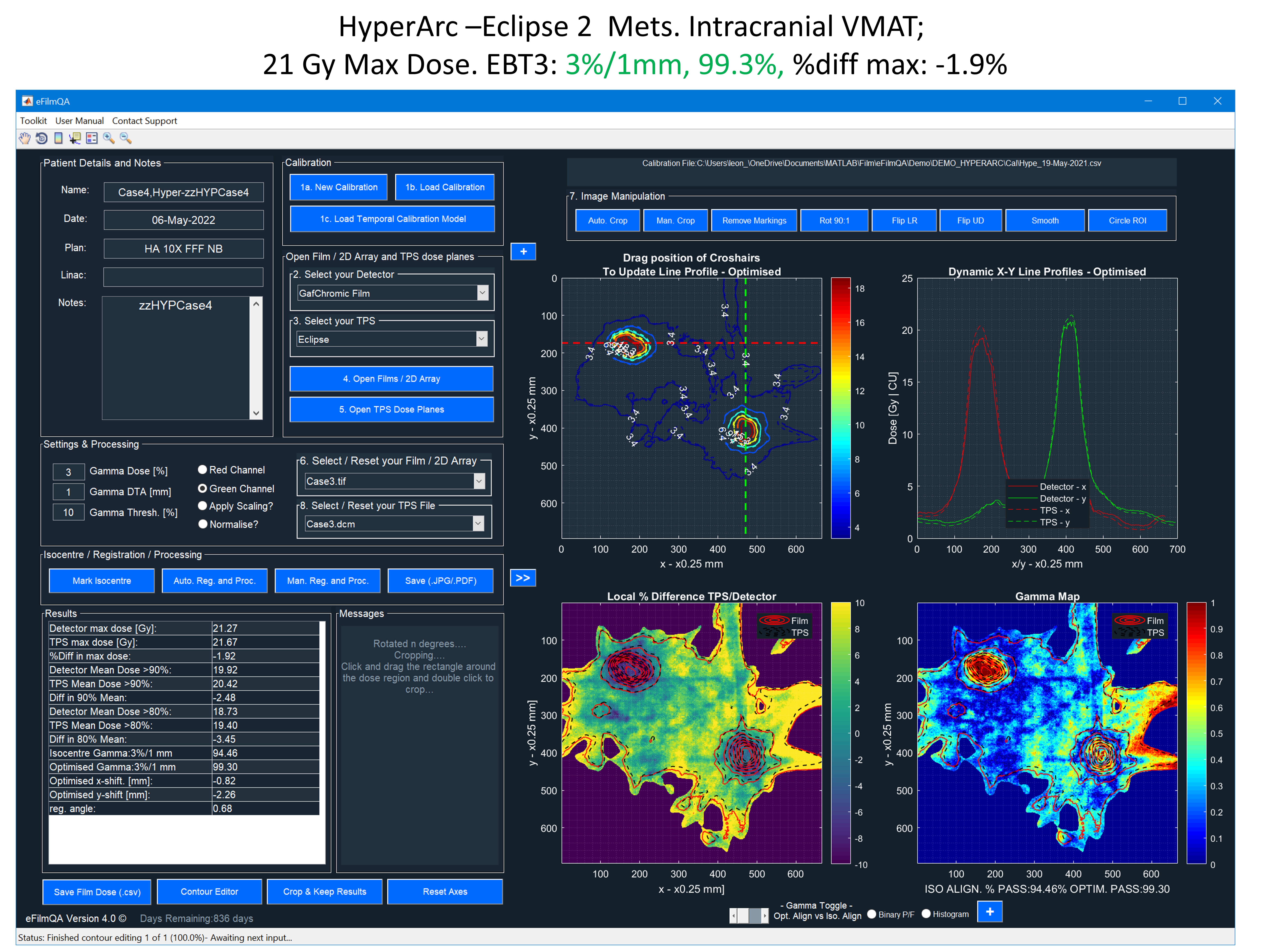 Load in and analyse as many measurement films as you’d like! Modern treatment techniques like Varian’s HyperArc and BrainLab’s Elements software require us to evaluate multiple metastatic disease sites. eFilmQA supports .TIFF image files, EPID images (DICOM), PortalDose (Varian Medical System) DICOM files as well as generic file formats.