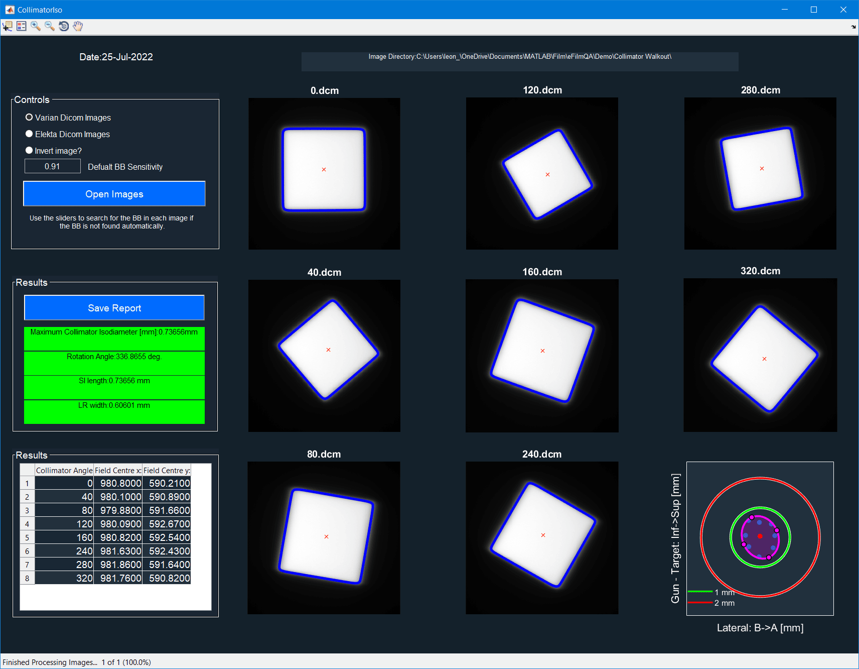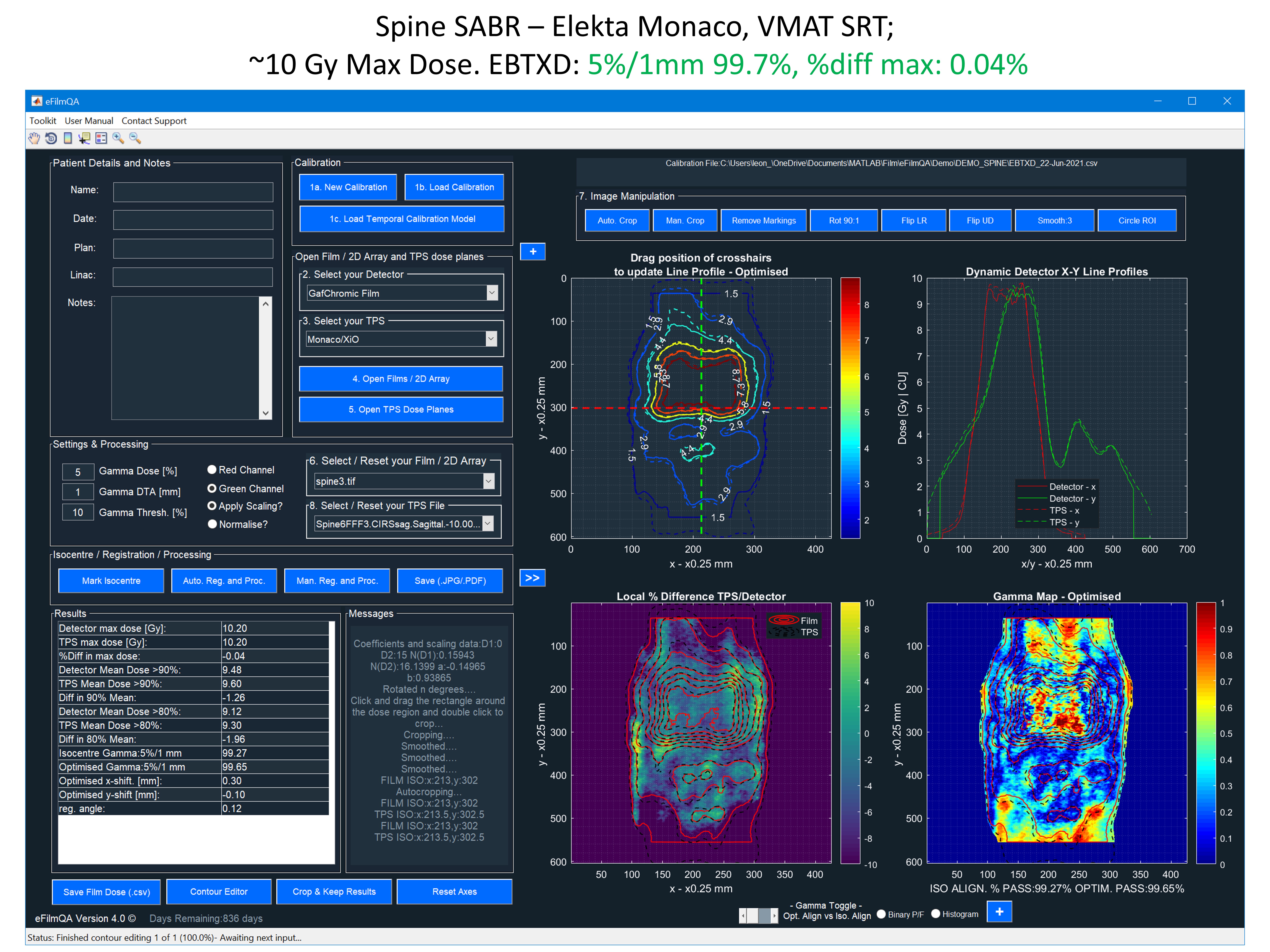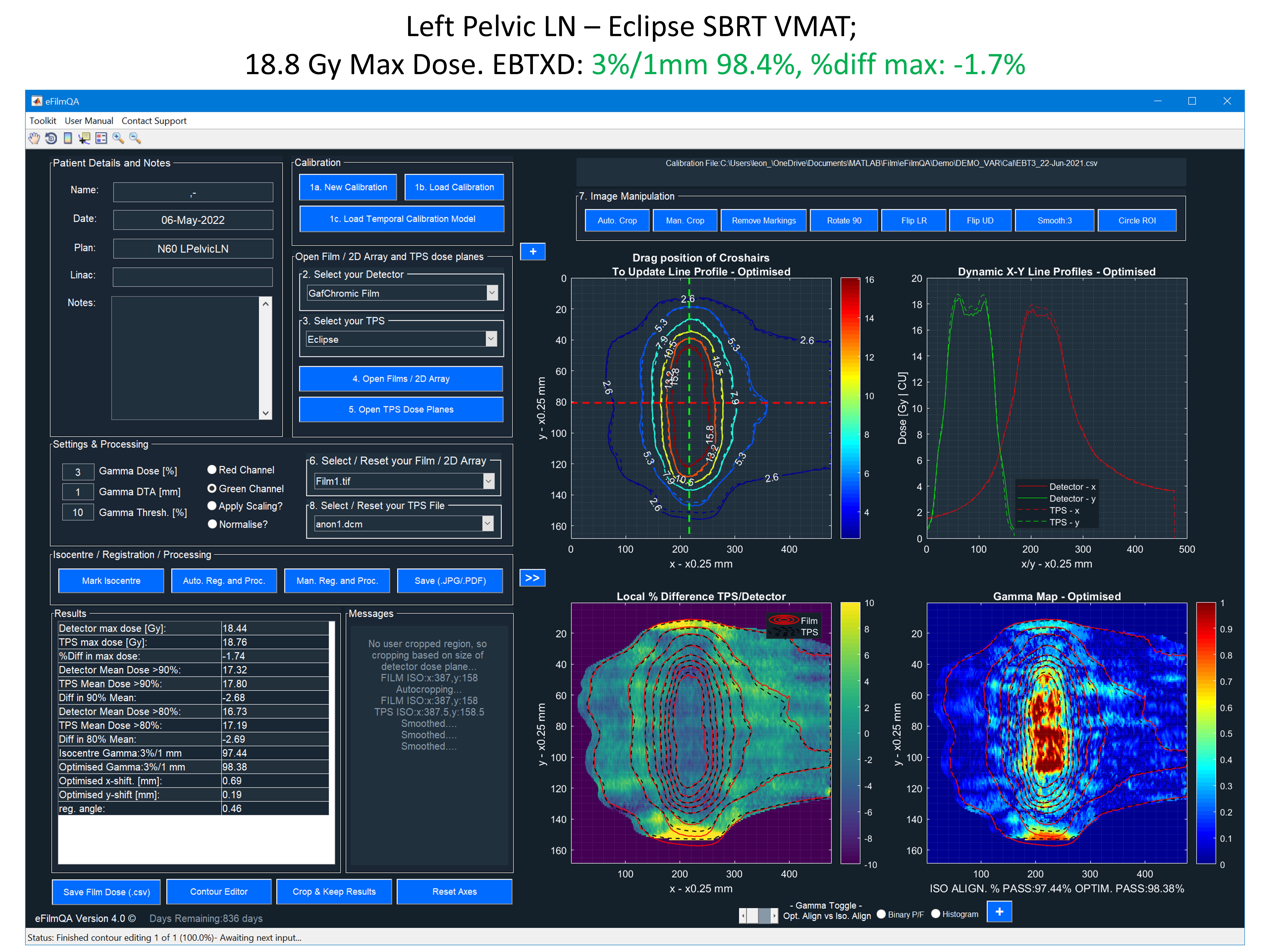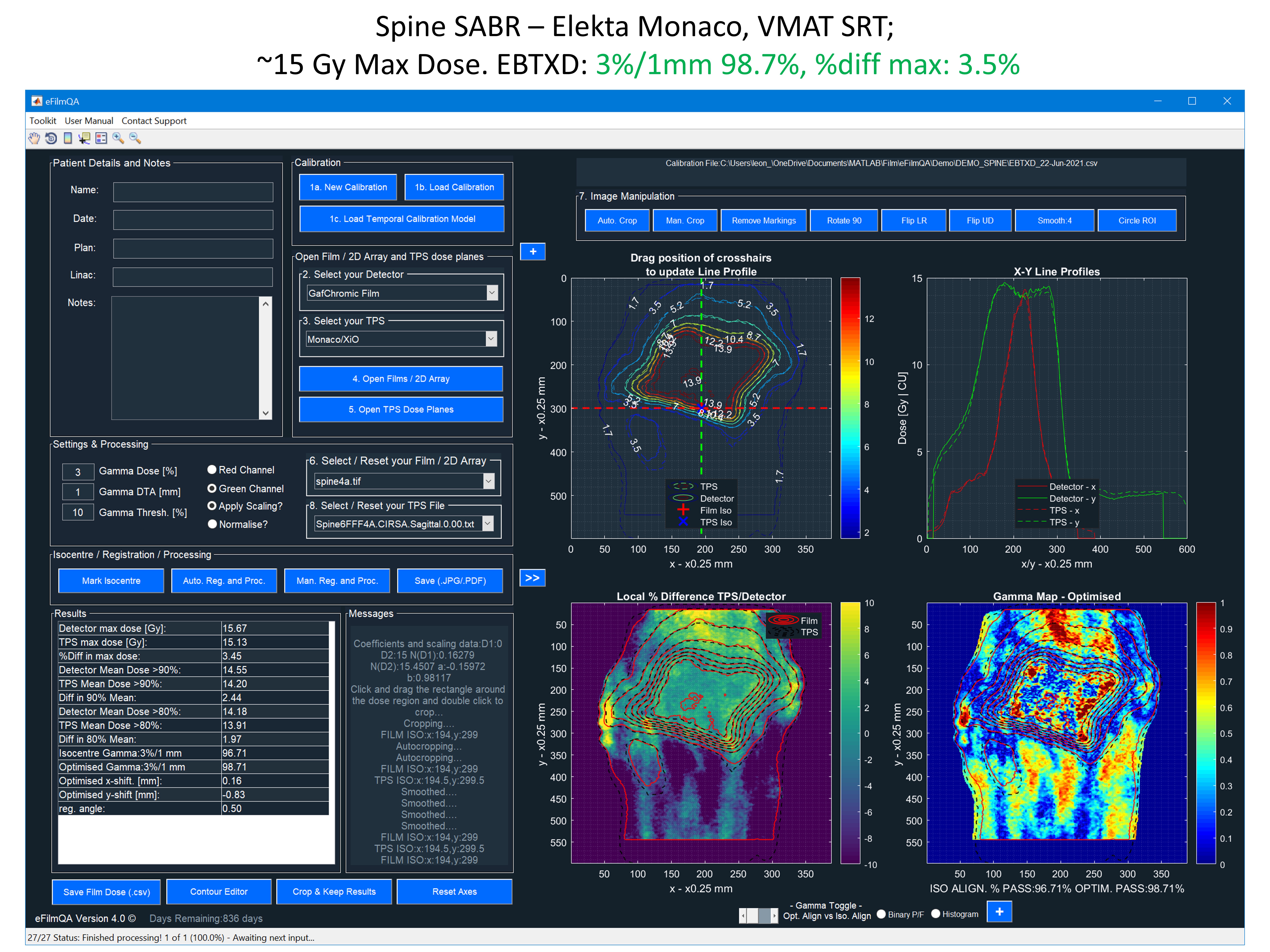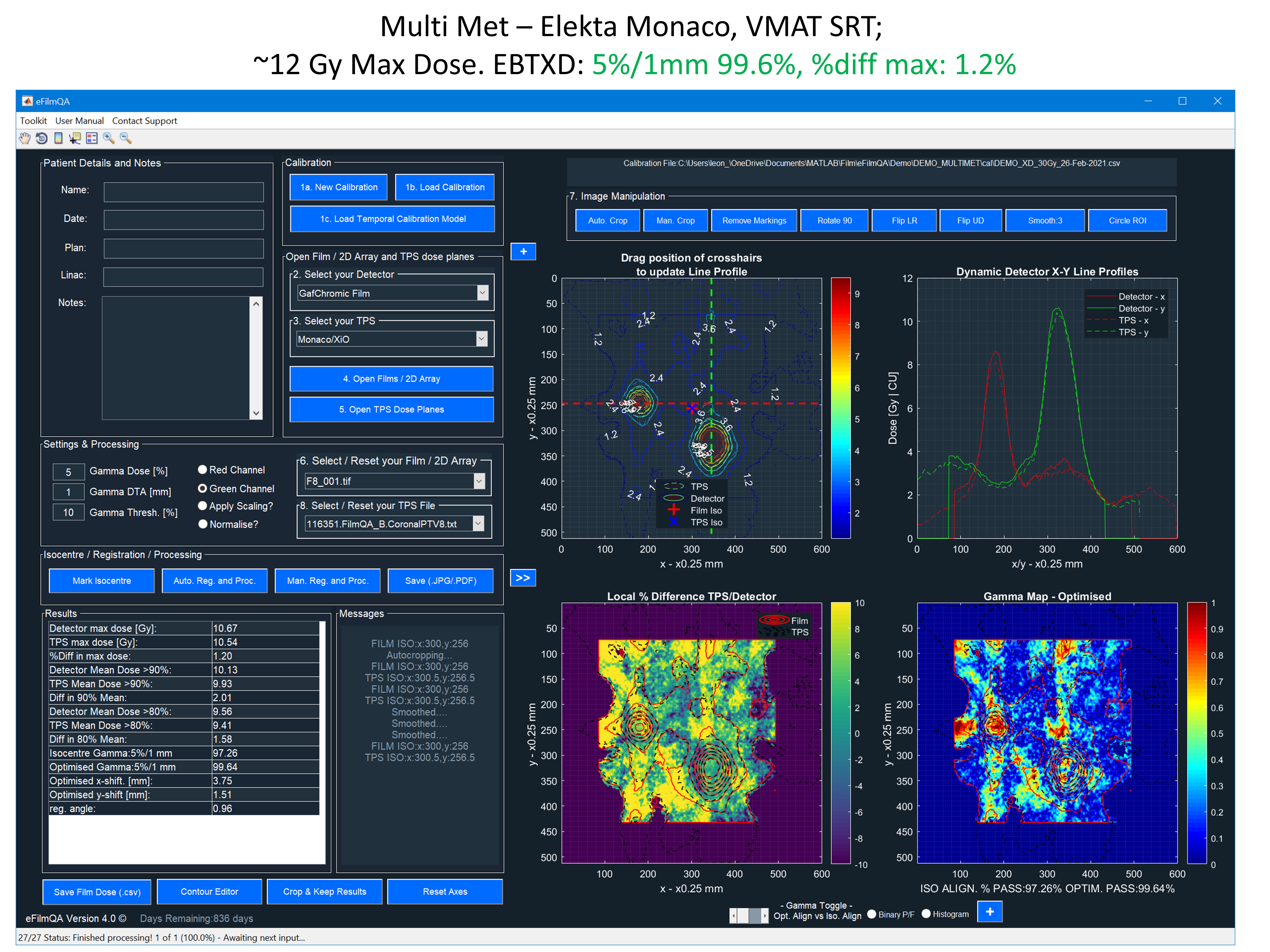 Load in and analyse as many measurement films as you’d like! Modern treatment techniques like Varian’s HyperArc and BrainLab’s Elements software require us to evaluate multiple metastatic disease sites. eFilmQA supports .TIFF image files, EPID images (DICOM), PortalDose (Varian Medical System) DICOM files as well as generic file formats.