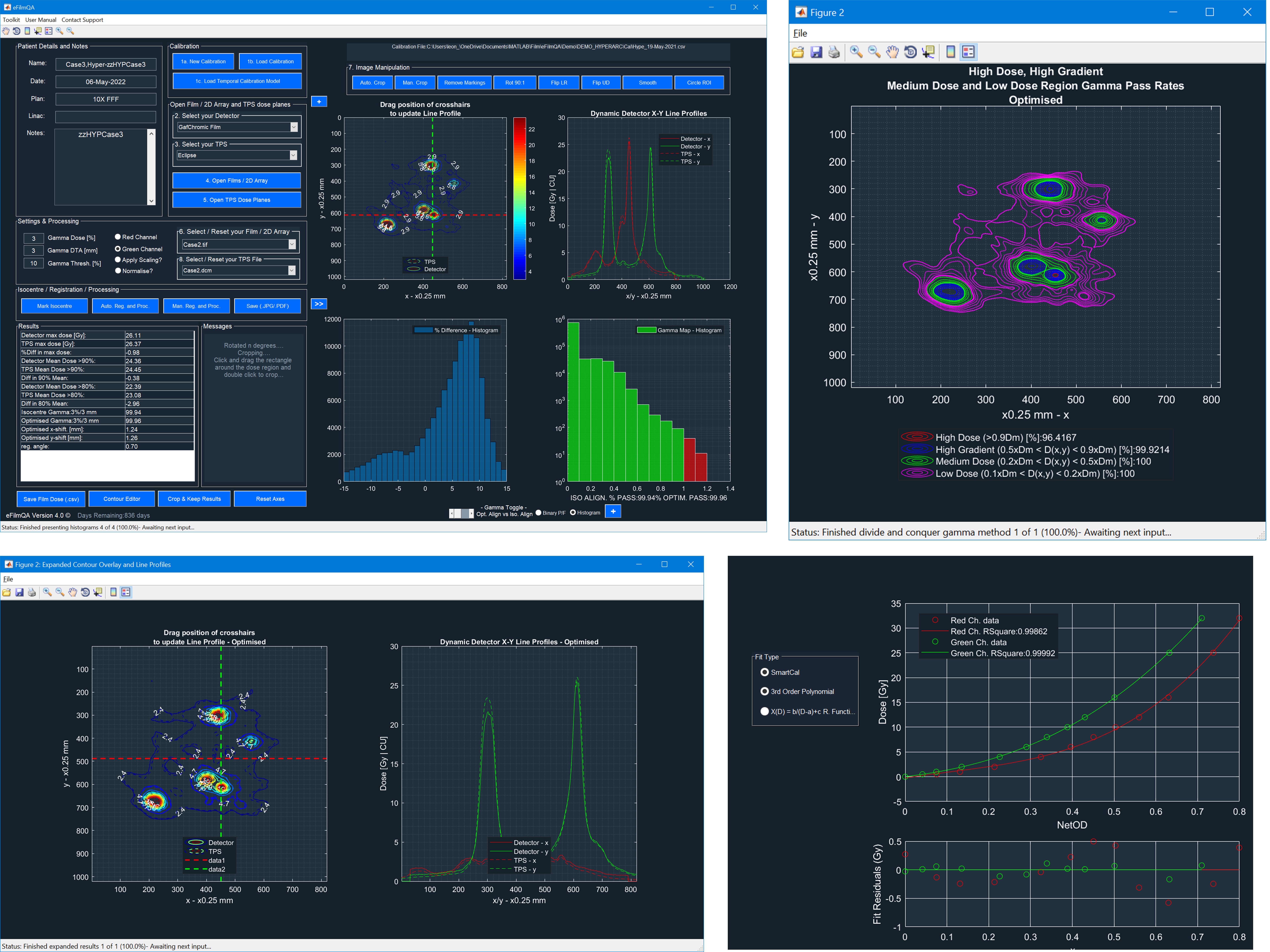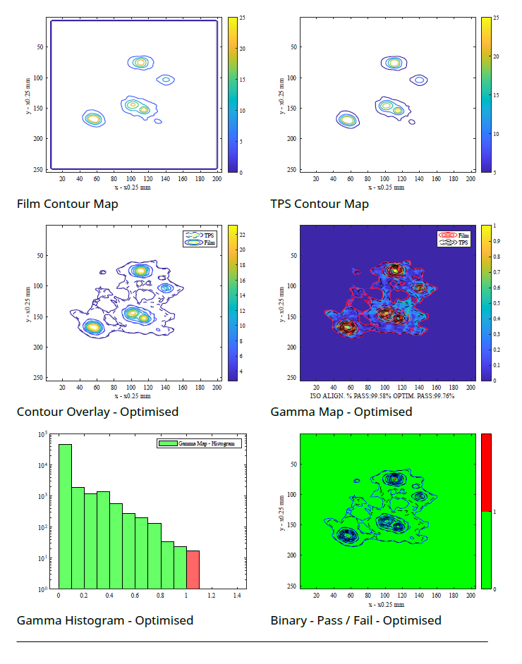 Compare isodose overlays, real-time dynamic line profiles, percentage difference plot, gamma maps with binary pass-fail options and histograms of gamma and difference results.